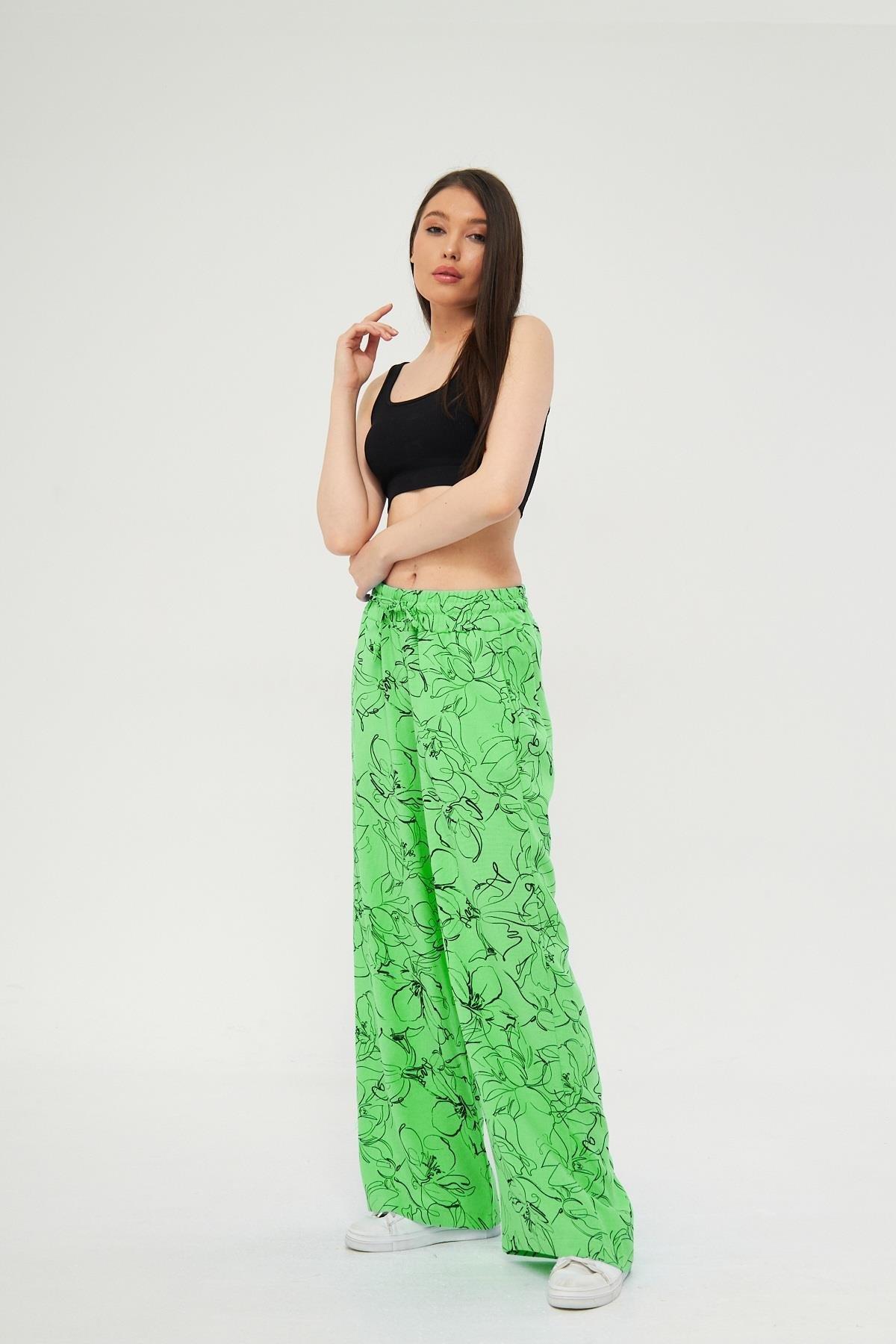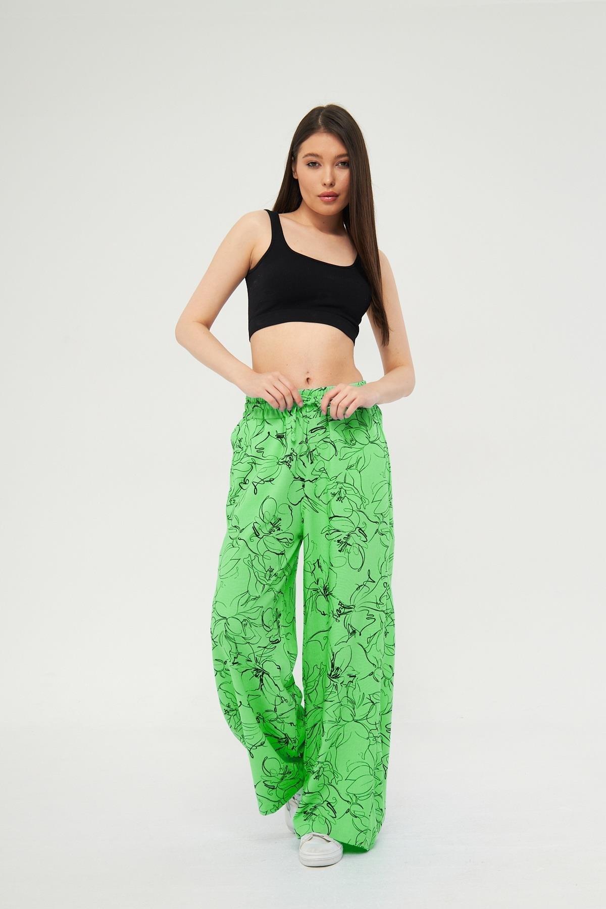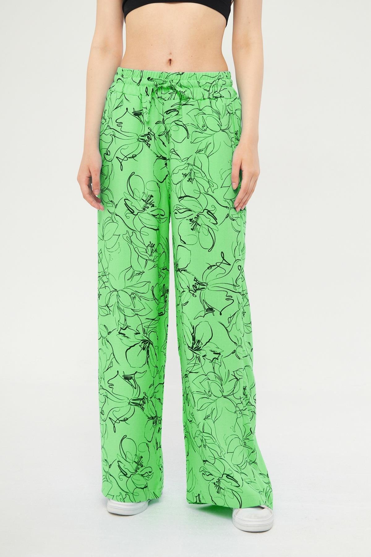 Camenta Kadın Mevsimlik Yeşil Desenli Keten Palazzo Pantolon